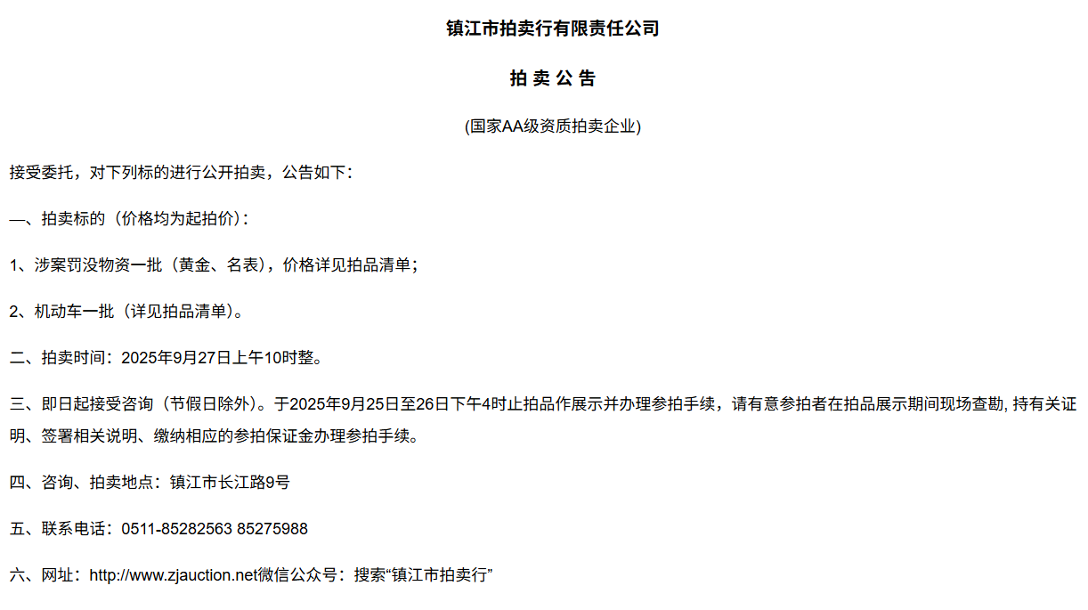 本公司受鎮(zhèn)江市公安局委托,對(duì)2025年度鎮(zhèn)江市市區(qū)摩托車(chē)上牌額度認(rèn)購(gòu)權(quán)進(jìn)行拍賣(mài),現(xiàn)將有關(guān)事項(xiàng)公告如下: